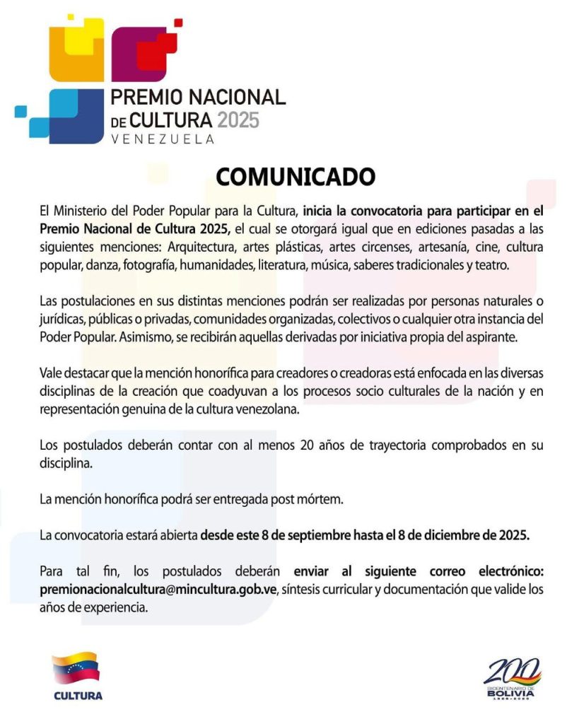 📨 Envía tu síntesis y documentación que valide los años de trayectoria al siguiente correo electrónico premionacionalcultura@mincultura.gob.ve