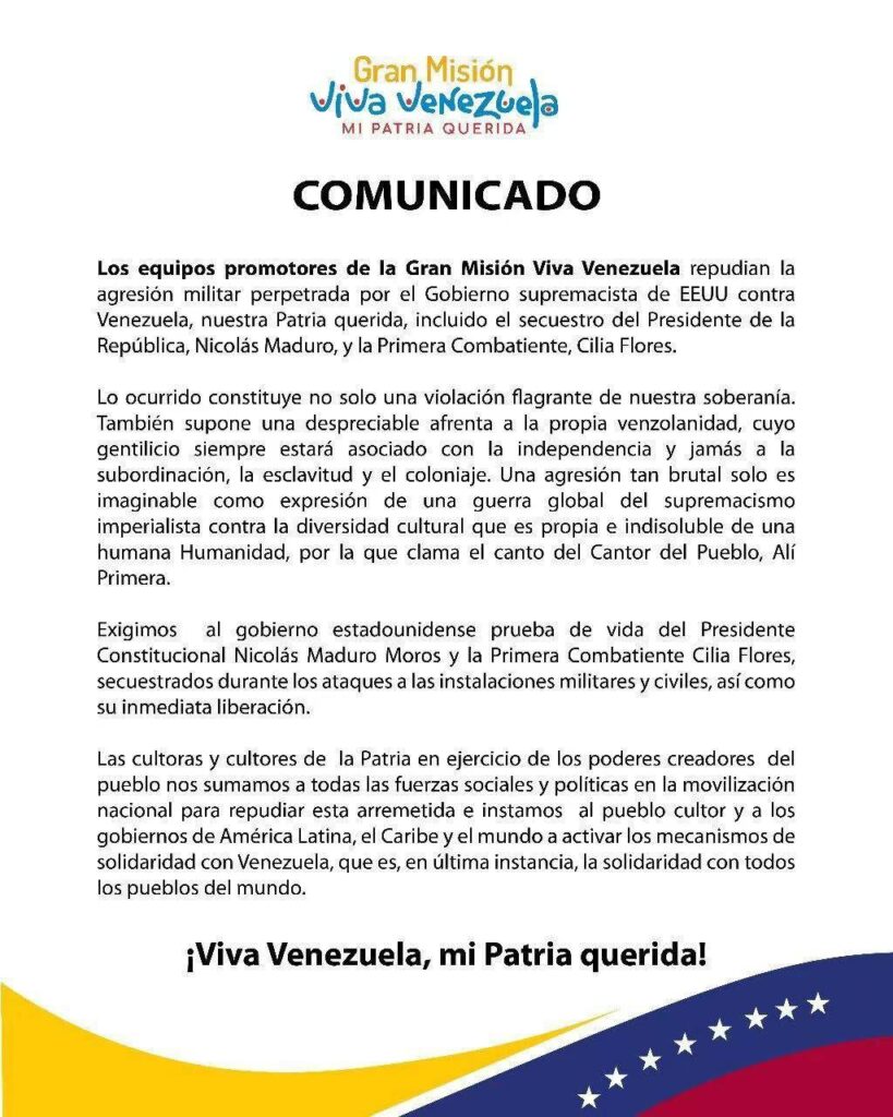 El equipo promotor de la “Gran Misión Viva Venezuela, Mi Patria Querida”, emitió este sábado 03 de enero, un pronunciamiento oficial en repudio a la reciente agresión militar de los Estados Unidos en territorio nacional. El manifiesto, difundido por el ministro de Cultura, Ernesto Villegas, a través de su canal de Telegram, destaca la unidad del sector cultural en defensa de la autodeterminación y la paz del país.