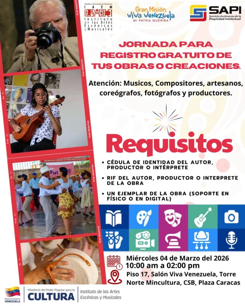 El miércoles 4 de marzo, el Instituto de las Artes Escénicas y Musicales (IAEM), ubicado en el piso 17 de la torre del Ministerio del Poder Popular para la Cultura, llevará a cabo una jornada de registro gratuito de obras. Esta actividad, organizada en colaboración con el Servicio Autónomo de Propiedad Intelectual (SAPI), ofrecerá a cultores y artistas de diversas disciplinas la oportunidad de registrar sus obras bajo la protección de las leyes de propiedad intelectual.