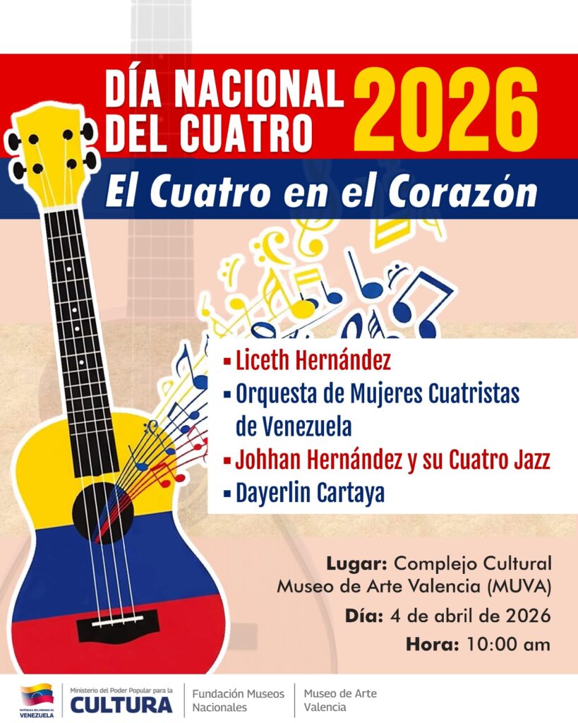 Con motivo de la celebración del Día Nacional del Cuatro, este sábado 4 de abril, se realizará en el Museo de Arte Valencia (MUVA), un evento que rinde homenaje a este emblemático instrumento venezolano. La programación, organizada por el gabinete estadal de Carabobo del Ministerio del Poder Popular para la Cultura, comenzará a las 10:00 a.m. y contará con la participación de destacados artistas.