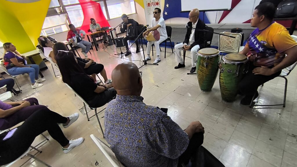Rafael Arrieta, docente y músico percusionista ofreció un viaje con su trayectoria musical y la influencia de ritmos colombianos en Venezuela. Destacó la importancia de preservar la cultura musical para las nuevas generaciones y la adaptación de géneros como el vallenato en el país. “Yo nací en Colombia. A la edad de seis años, me traen a Venezuela, y por los años setenta, es que comienzo a trabajar con la música colombiana, porque en esa época venían muchos grupos colombianos, empecé a preguntar a amigos colombianos que trabajan aquí en música, y me empiezo, como dice uno, a apuñalar todos esos ritmos. Y comencé a acompañar a tanta gente, y aprendí todos esos ritmos”, comentó Arrieta.